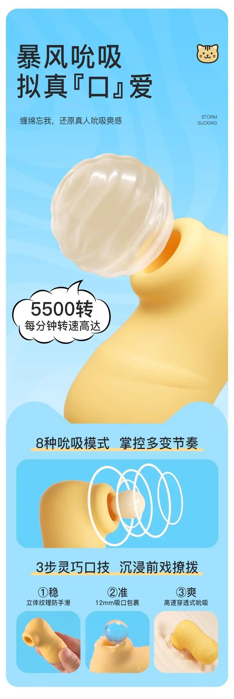 吮吸器: 拥有8频强力模式,最高可达5500次/分钟的高速吮吸。12mm广域口径,精准覆盖,专注于豆豆刺激,助力轻松探索体外糕潮。