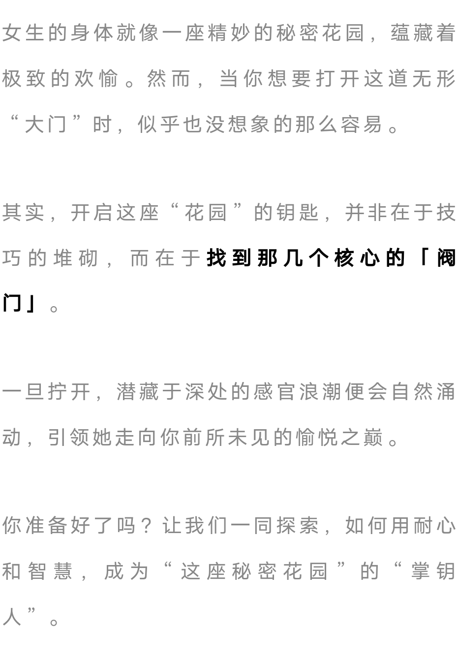 如何打开女性身体愉悦的3个“阀门”! 上述所有的技巧你需要运用得当才能生效,所以,我们要探索有效的刺激方式,而不要做费力不讨好的事情。 作者: 桔色联盟成人自营 声明:本文仅为产品使用指南与人物资讯,不含任何色情内容,不提供任何观看方式,不涉及非法信息。如若本站内容侵犯了原著者的合法权益,可联系我们进行处理。