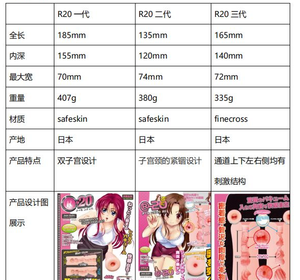 (1)R20 一代 双子宫设计,长度是三款里面最长的一款,因为长度的属性设 定,吸力也是三款里面最强的,由于一般人的长度是顶不到底部的,但是也就是因为这个原因,让人玩 R20 一代的适合不由自主的想 要深入,结果是人们在玩的时候几乎根根见底,十分刺激。通道螺 旋+数量极其密集的肉粒倒刺,抛却真实性,只极尽可能的追求满分快感