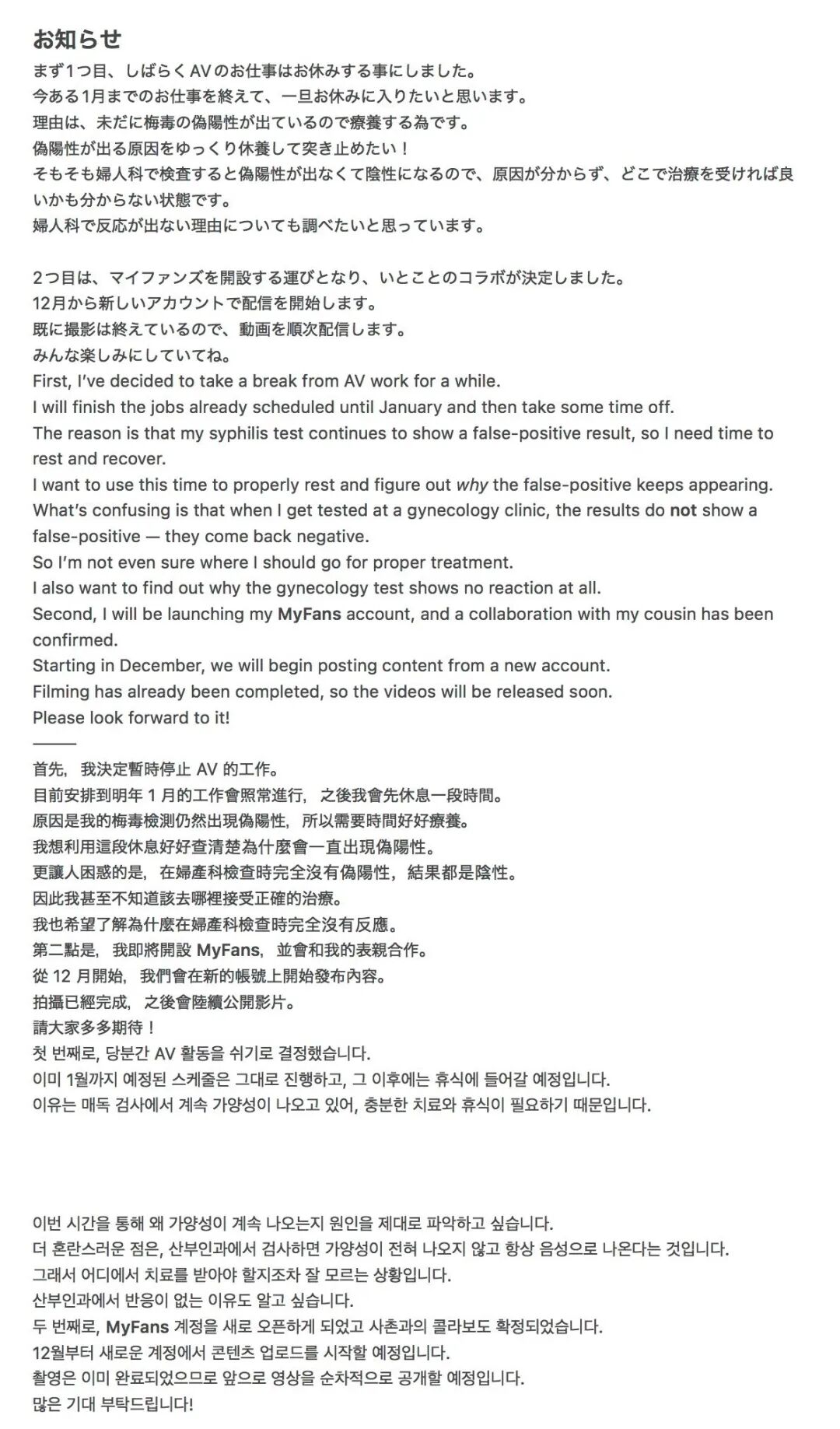 而就在前两天,她终于在社交媒体上发布了休业声明,总算给了大家一个详细的情况说明。她表示,之前已经安排好的工作会全部完成,然后预计在明年一月会正式暂停所有活动。至于突然决定休业的原因,她在声明中也非常坦诚地写了出来——原来从去年开始,她的梅毒检测报告反复出现“伪阳性”的结果,这不仅预示着她的身体出现状况,同时也给她带来了非常大的心理压力,因此她需要时间好好治疗和休养,然后利用这个时间把出现伪阳性的原因找出来。
