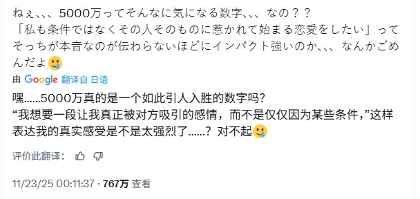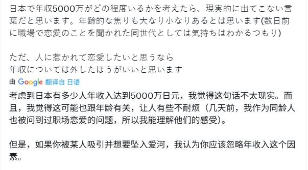 因为提了个希望对象年收入5000万円的标准,这个事也导致了她一度挨冲,然后就是在前两天她又发文,表示“为什么大家都只盯着这个5000万円的标准”。