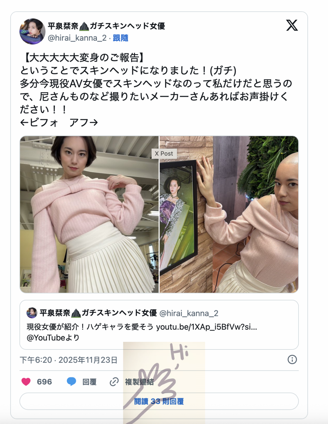 所以平泉栞奈说如果有片商想拍「尼姑」的题材请尽管找她,而她除了光头的造型外,有必要也会戴着假发演出,使命必达,希望商演的邀约如雪片般飞来〜