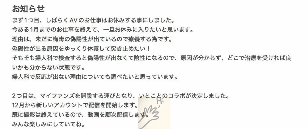 发生了什么事吗?很意外地,武藤あやか(武藤彩香)很详细地写了出来,原来是她的梅毒检测持续出现伪阳性的结果,需要好好治疗休养ー武藤あやか(武藤彩香)说想要把一直出现伪阳性的原因找出来,然后暂停拍片的工作调养身体⋯