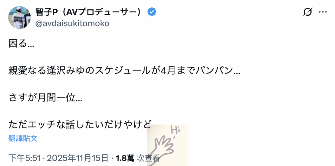 为什么是「公认」呢?因为资深制作人「智子P」是在X这么写的:「真是有点困扰啊,亲爱的逢沢みゆ(逢泽美优)行程满到四月,真不愧是月间第一的销售冠军啊⋯但老实说我只是想找她聊点色色的事啦。