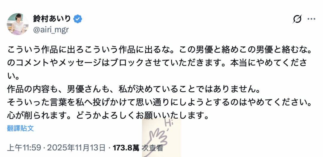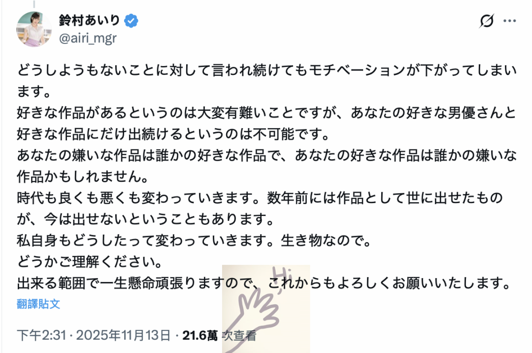 「请务必演出那样的作品」、「别再演出那种作品了」、「一定要和那位男优合作喔」以及「别再和那位男优合作了」铃村あいり(铃村爱里)说看到这样的留言她一律封锁,请大家不要再传这样的讯息了ー因为作品的内容和合作的男优都不是她做决定了,打开私讯都是看到这样的留言让她觉得心累,请大家行行好,别再传上述内容的私讯了