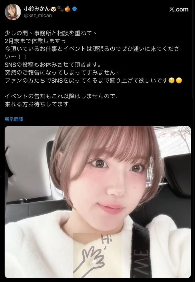 要休息多久呢?小铃みかん(小铃蜜柑)表示,即日起休息到2026年2月、也就是大概会休息三个月左右; 之前已经接到的工作和活动都会努力完成,所以请大家一定要来看她~