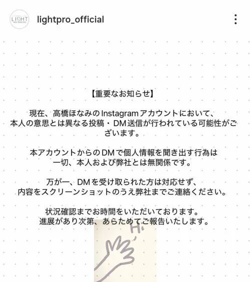 简单来翻一下意思:经纪公司LIGHT是在声明中表示,高桥ほなみ(高桥保奈美)的IG帐号有可能会出现非本人的发文及发送私讯(DM),如果该帐号透过私讯询问个人信息,那跟经纪公司及高桥本人完全没关系,请千万不要回应,并且立刻截图和事务所联络〜