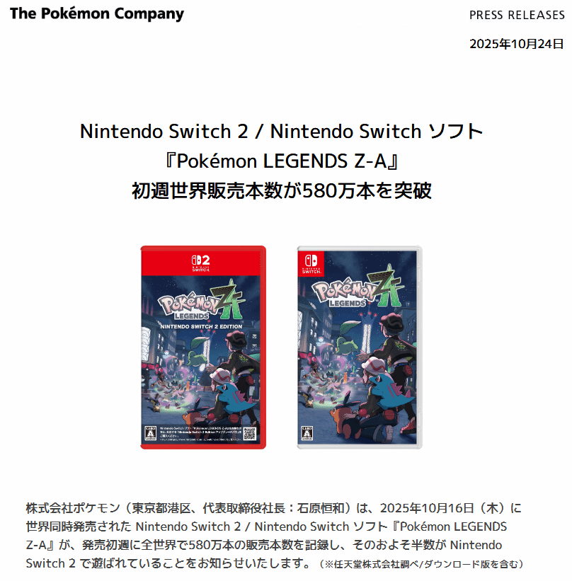Game Freak旗下《宝可梦》系列最新作《宝可梦传说Z-A》已于10月16日正式发售,而距离游戏发售仅仅过了一周的时间,宝可梦公司就宣布:首周销量已经突破了580万套。