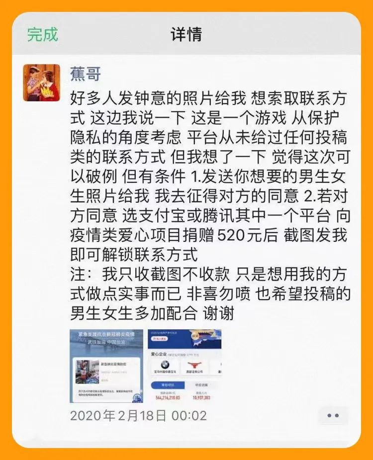 让自己的会员晒捐款单,用捐款单来兑换心仪女生的联系方式。这种慈善方式说实话我也是活久见了,但只要通过自己的方式切切实实地为社会作出贡献,还是值得尊敬的,毕竟蕉哥贡献的这些核心资源,对他来说也是真金白银。