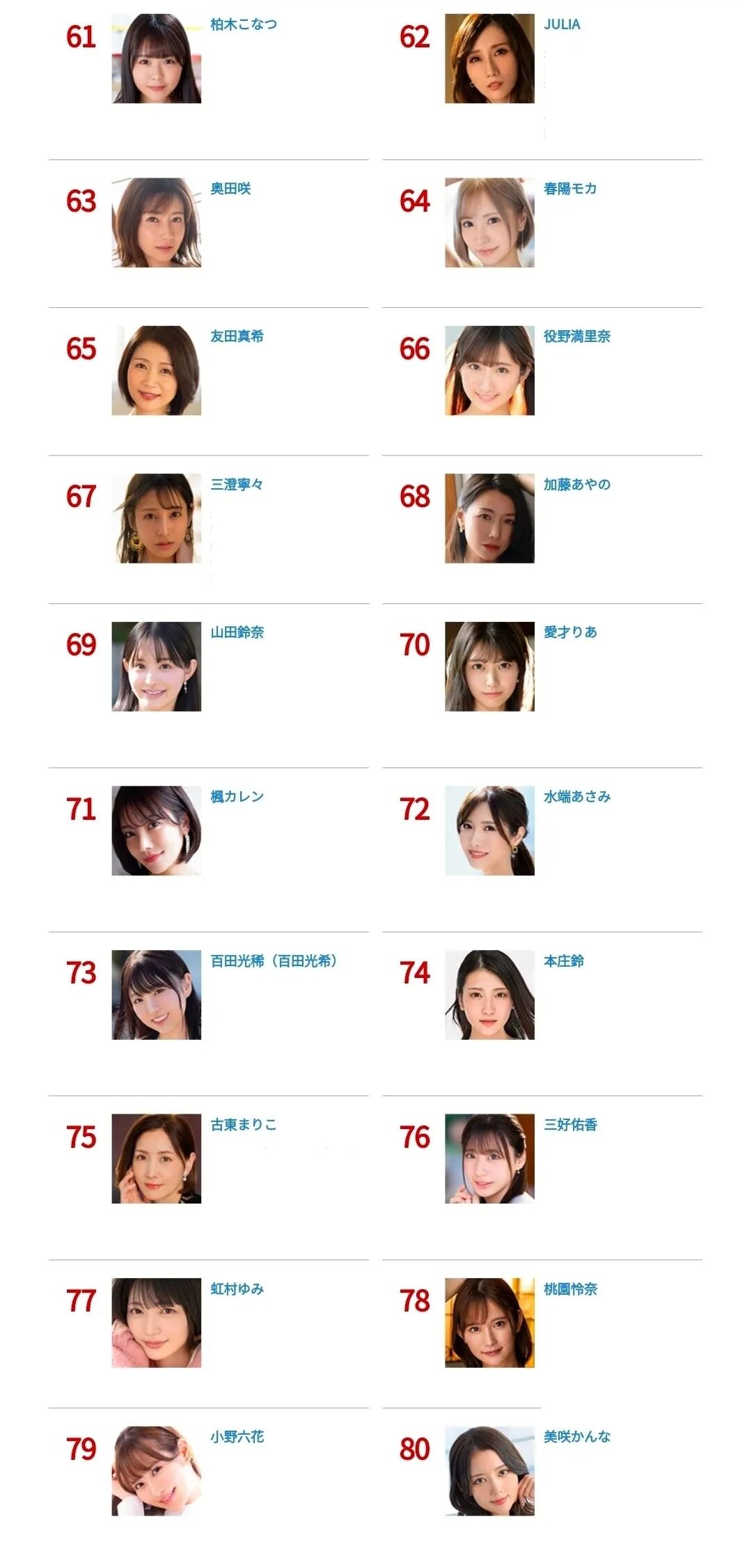 ●和去年7月份差不多,JULIA今年8月同样没有新作发布,期待一下本月能正常更新吧。另外必须要说的是,本次天梯榜除了本庄铃上榜外,其他多名SOD强将似乎都“集体消失”,相信这定有原因,我还需等待查证更多信息再和大家作特别说明。