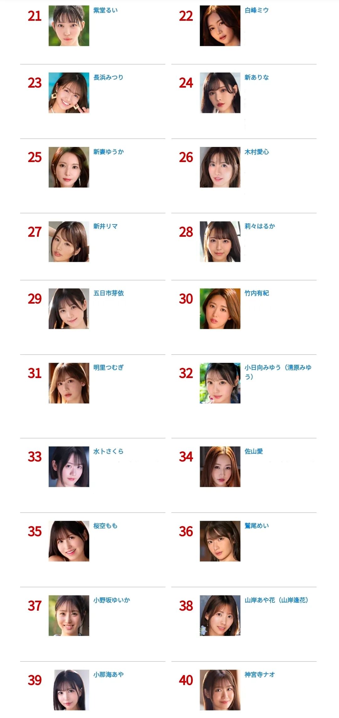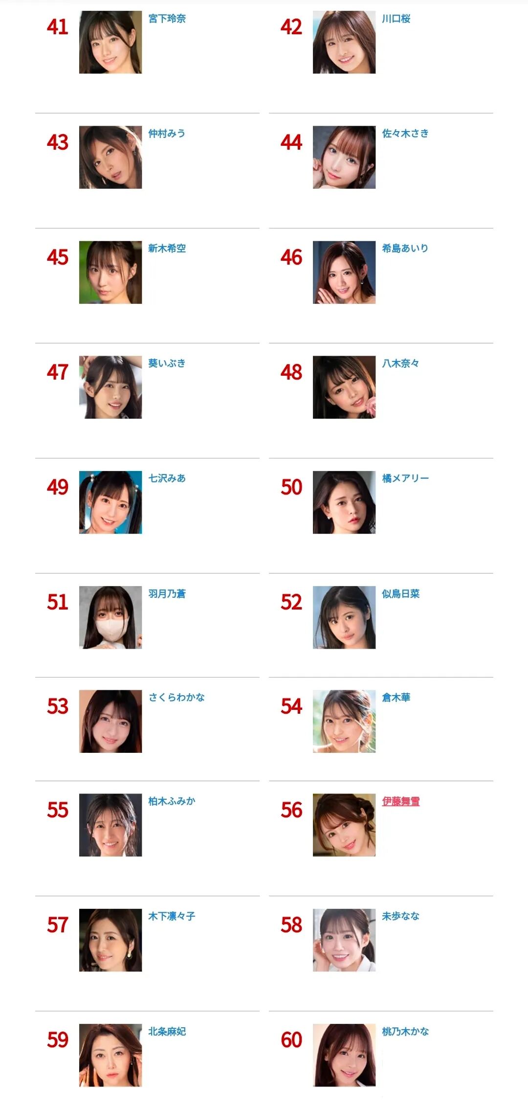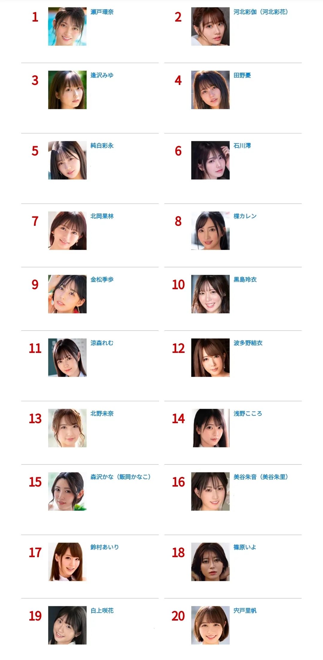 ●每月榜首的实力依旧无需多言,河北彩伽、田野忧、石川澪等多位以往的榜前常客本月也稳定发挥。目前值得一提的是,本榜段的逢泽美优、北冈果林、黑岛玲衣等多位新生代选手大都是近期从一线片商专属转为企画选手的,她们失去一线专属身份的原因无他——专属作品卖不动(但这不能单纯归结为个人影响力不够,还很可能与一线片商的制作题材较为保守、固化等多项因素紧密相关),如今,她们转攻企画领域,作品更加丰富多样,能满足更多不同喜好的观众群体,或许这是她们重新证明自己的更好出路吧。
