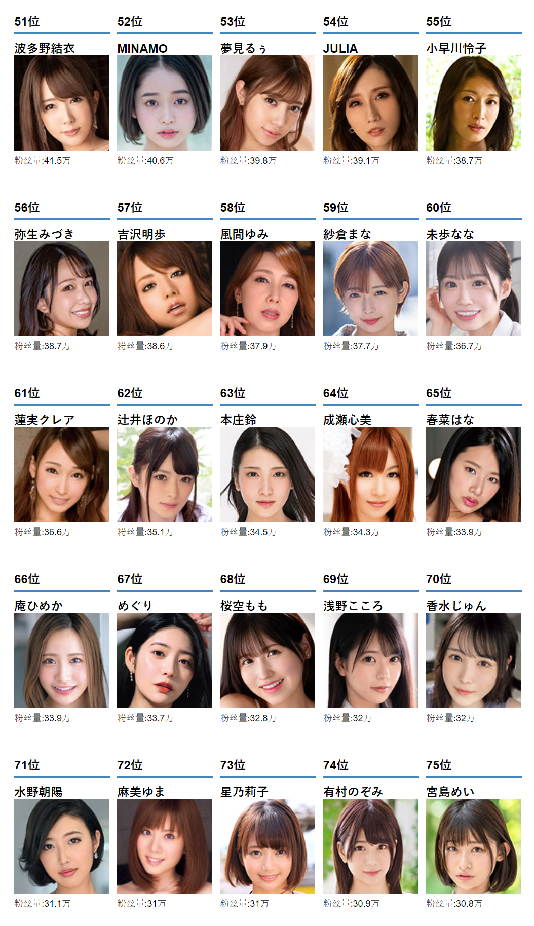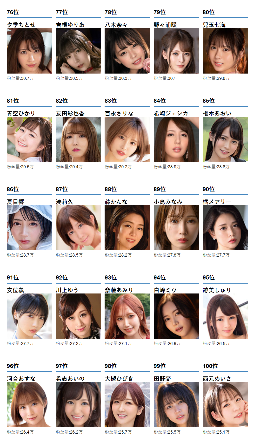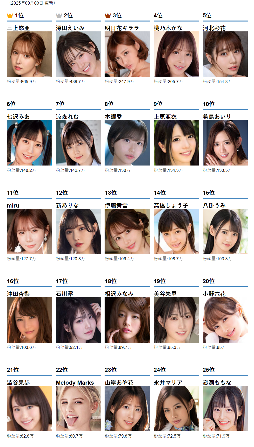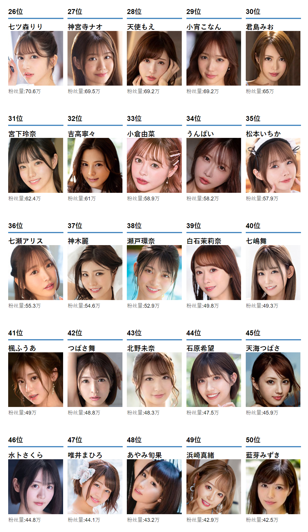 注:榜单包含已引退但仍有公开作品流通的女演员,不包括已全面停止作品发行的演员。社交媒体账号仅统计X账号。