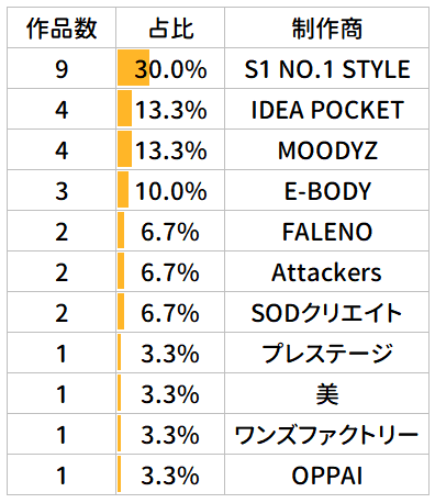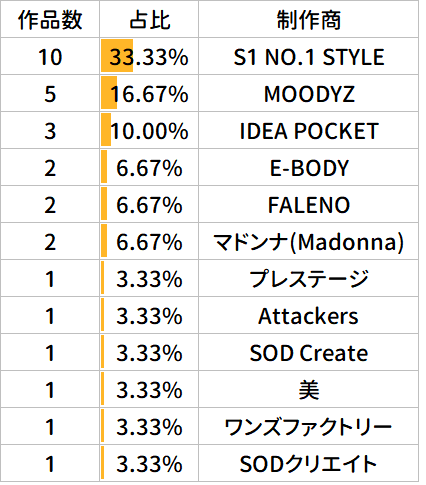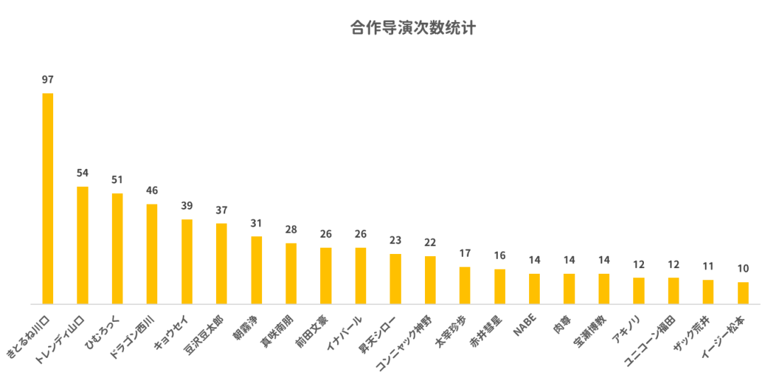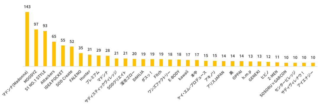 从数据来看,结城的作品合作导演相当广泛,但也呈现出明显的“头部效应”。其中,川口导演以高达97部作品稳居第一,几乎是他近几年演艺作品中重要的合作导演。川口导演也深受几大头牌制作商青睐,常年为麦当娜、攻击者、S1、魔笛导演作品。