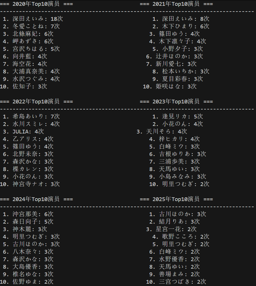 再对数据细分看看,统计出每年合作最密切的艺人 TOP10