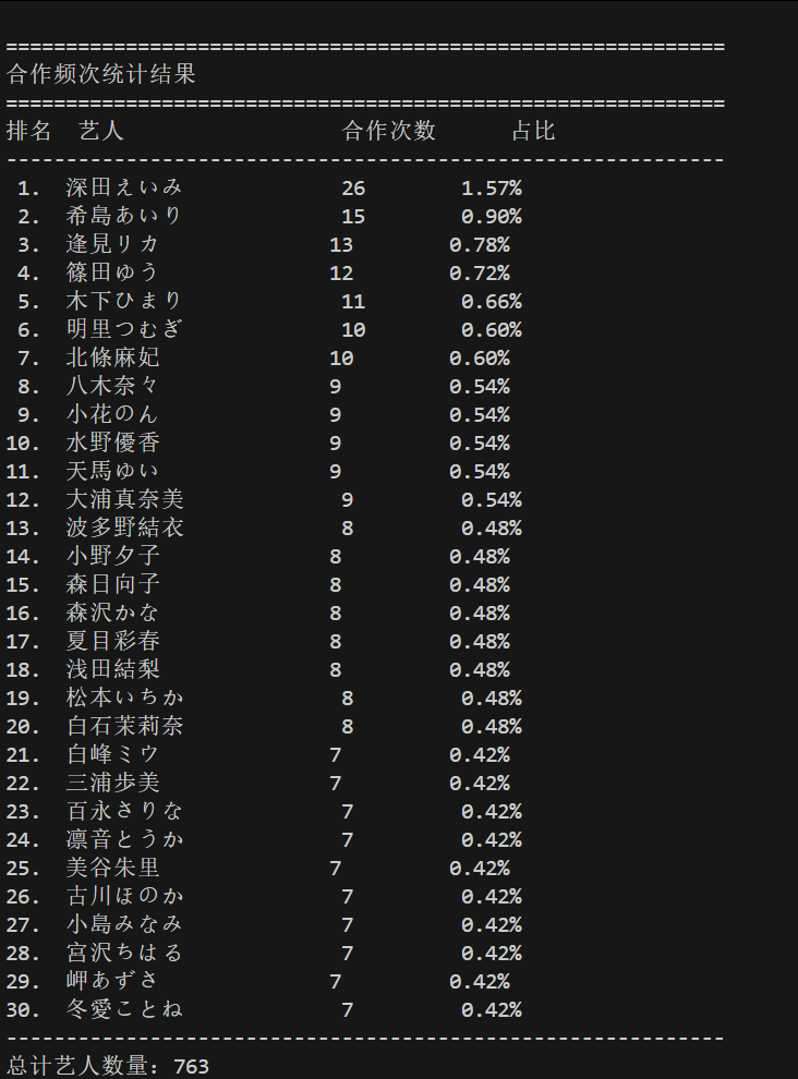 接着,看看近5年,累计合作艺人频次,数据就直接放TOP30。