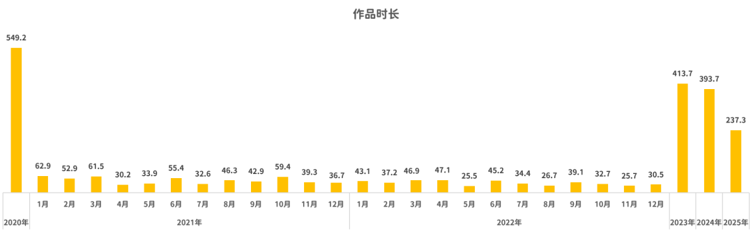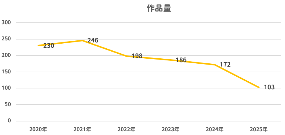 观察综合近5年数据,结合作品时间发布的时间戳,统计得出,平均每年发布206.4部作品。