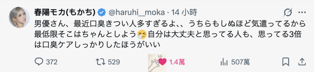 「男优们,最近真的有太多人口臭的很严重,当我们女星拼命地做好各种礼仪已经卫生的自我管理时,你们至少也该把这一点(口腔卫生)做好吧?“我就算你们觉得”我应该没问题吧“,也请把你以为的程度,再乘以3倍上去做好口腔清洁比较好喔。」