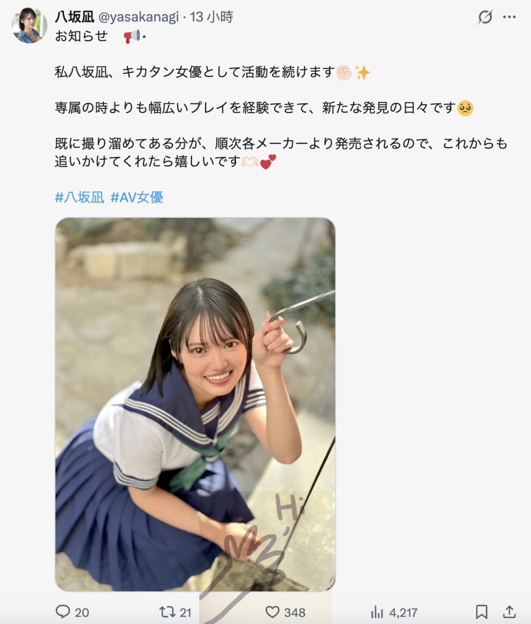 20261月第一档的发片清单公布,相信大家都注意到8月出道的「八坂凪」并没有出现在Moodyz的发片清单上,而本人也很坦率地说了,她和Moodyz的专属合作关系已经结束,接下来她要以企画単体女星(キカタン)的身分继续在这一行打拼下去: