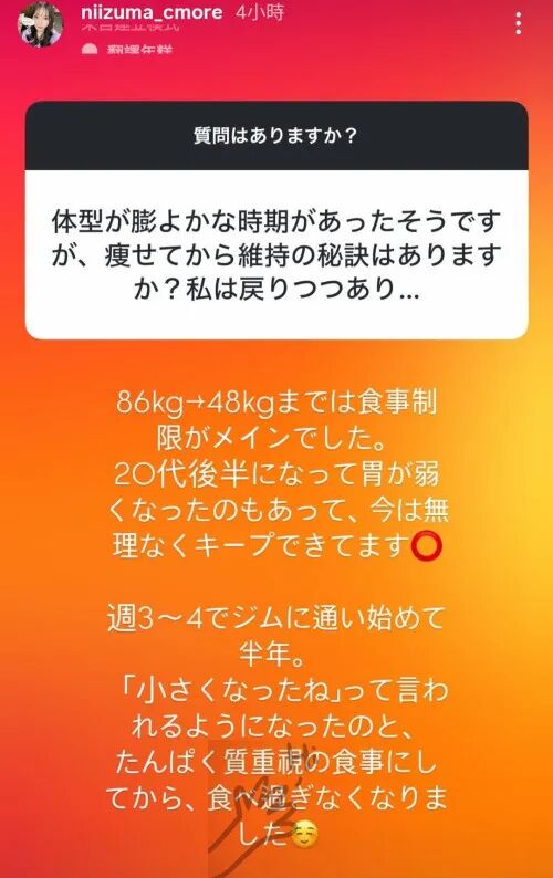 这是她在IG问与答中的爆料,新妻ゆうか(新妻优香)说自己最重的时候有86公斤,现在则是48公斤重,减重的秘诀是「饮食控制」: