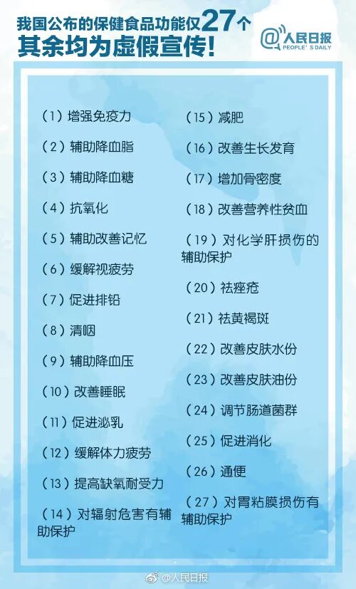 目前我国政府部门审批的保健食品功能表只有27种,不在这些范围内就是虚假宣传。