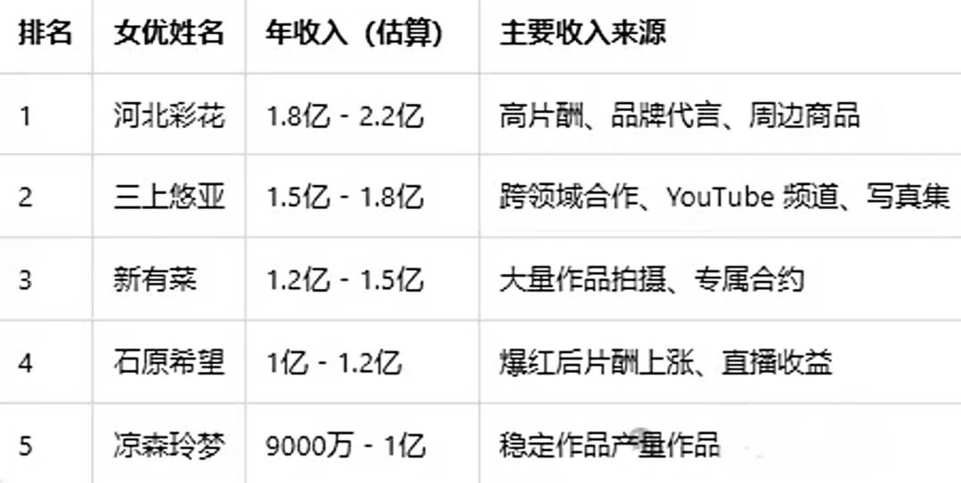 霓虹丨2025 年业界女优排行与收入,一年收入破亿的居然是她?