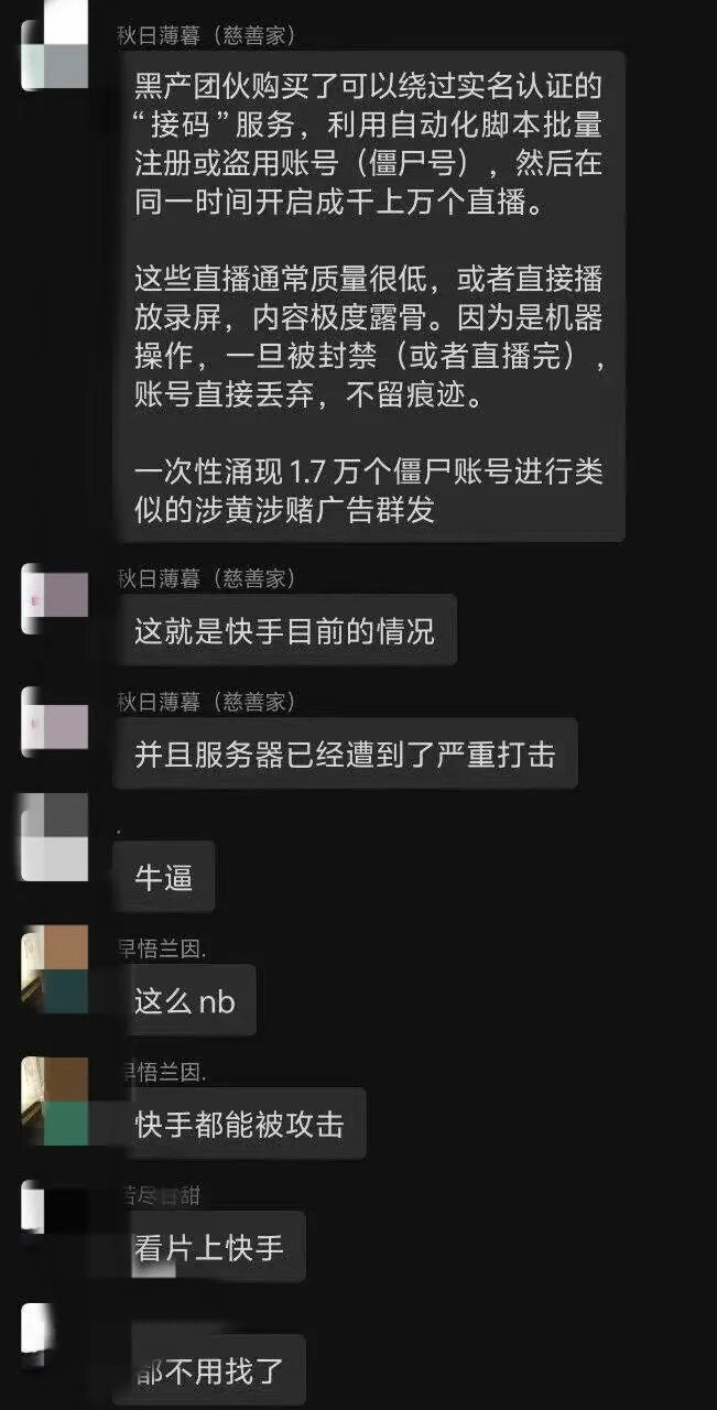 就在昨晚,快手平台遭到境外灰黑产组织的恶意网络攻击。一时间,大量涉黄内容涌入各个直播间,引发网友关注,快手平台迅速启动应急预案,并向主管部门报告,至23日凌晨,平台基本恢复正常访问。