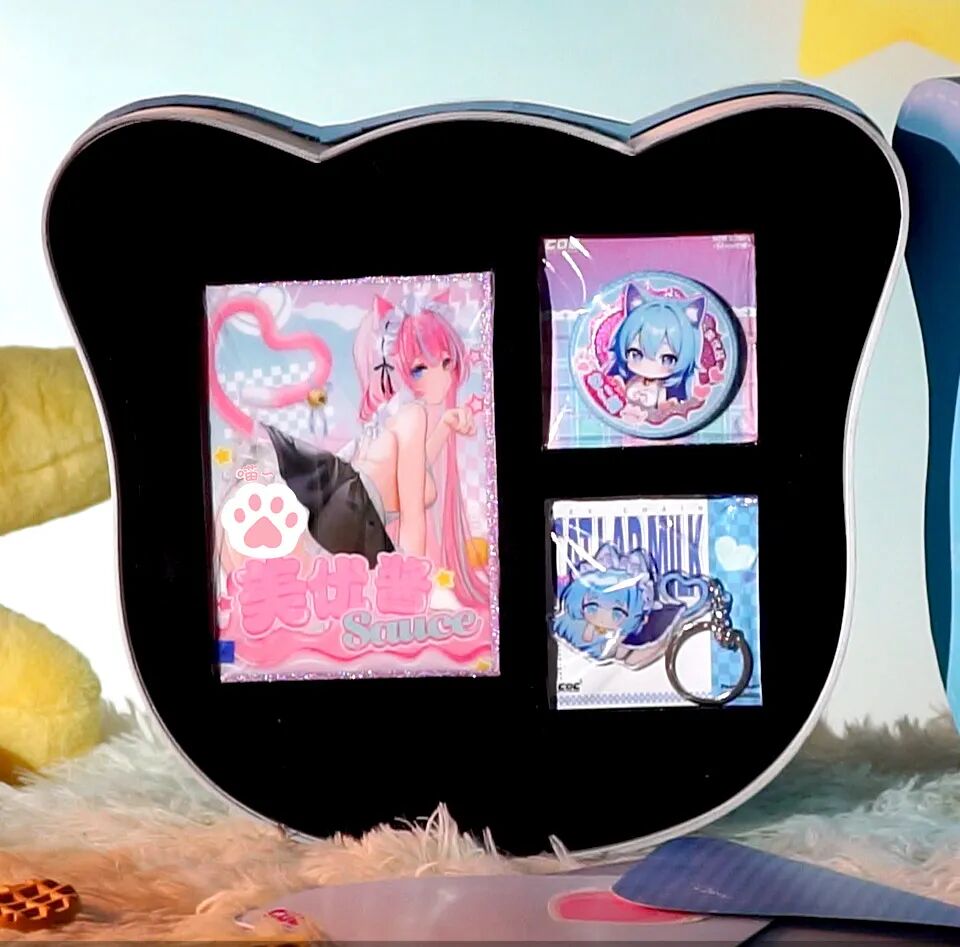 第二层是美优酱周边三件套:色纸、吧唧、钥匙扣,开箱即吃谷。