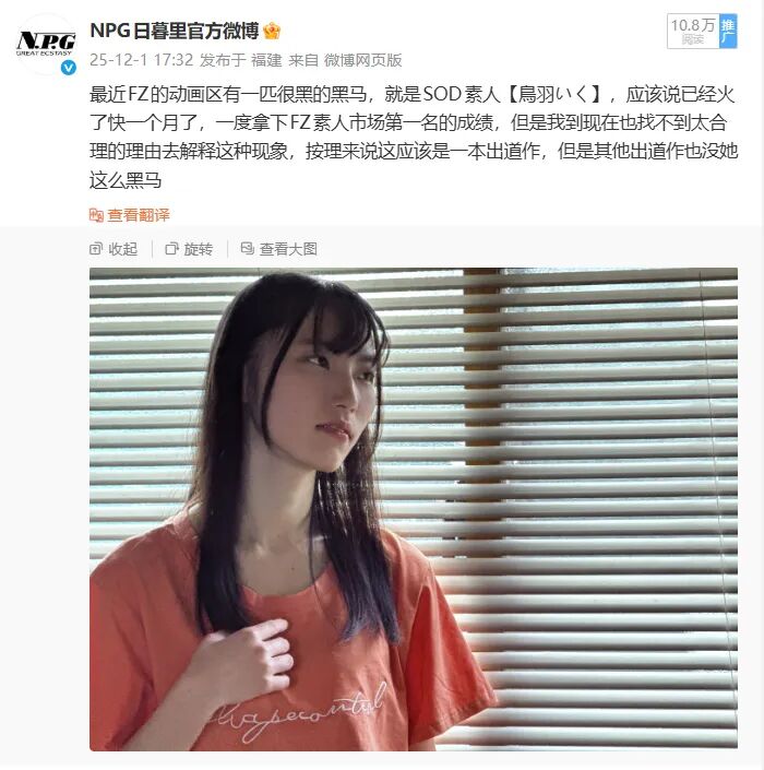 2025年度大宝星之队没什么暴击率,但是旗下品牌是真出暴击,不仅仅是女子社出了俩妖孽,旗下的素人子品牌也是暴击频出,特别是前不久的【鳥羽いく】真可以说是年末暴击出来的超级黑马,在FZ的动画区一度挂在TOP上。