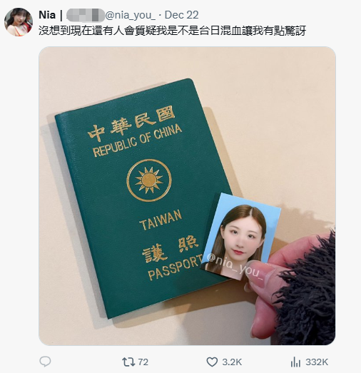 由于制作公司常为演员塑造特定人设,所以NIA的混血身份一度受到部分观众的怀疑。面对质疑,近日她在社交平台公开了自己的台湾地区护照,清晰展示了个人背景。至此,她的中日混血身份已毋庸置疑,也让我们更真切地认识这位始终活跃在镜头前后的演员。