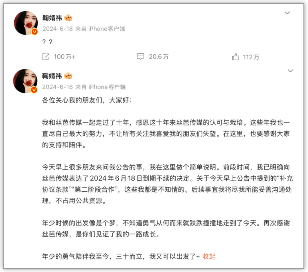 2024年6月18日,丝芭传媒一大早便在社交平台上祝鞠婧祎生日快乐,并发布公告称双方第一阶段合作圆满完成,根据补充协议条款,即日起进入第二阶段的合作。
