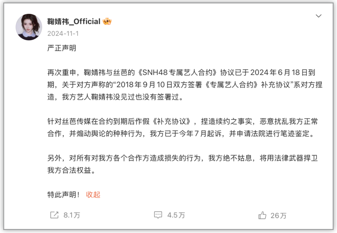 一小时后,丝芭发布长文回应称,补充协议于2018年9月10日由鞠婧祎本人签署,具备既定效力,此次是鞠婧祎单方面突然通知公司,要求解约。