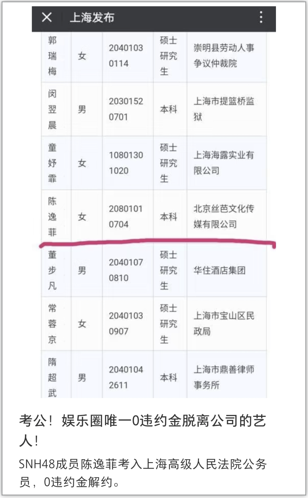 一个广为流传的案例是,BEJ48(SNH48姐妹团)的陈逸菲,顺利上岸上海市金山区人民法院公务员,无痛解约。因而有网友调侃,“只有考公才能毫发无伤地逃离丝芭”。