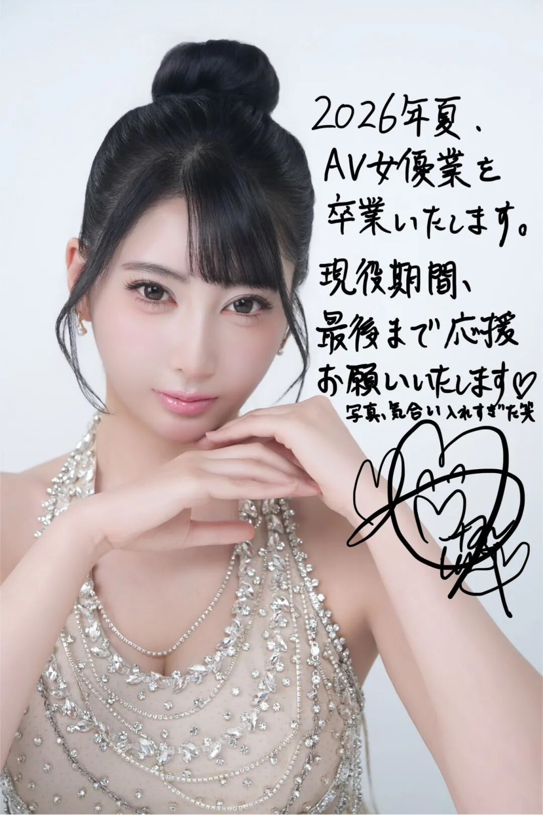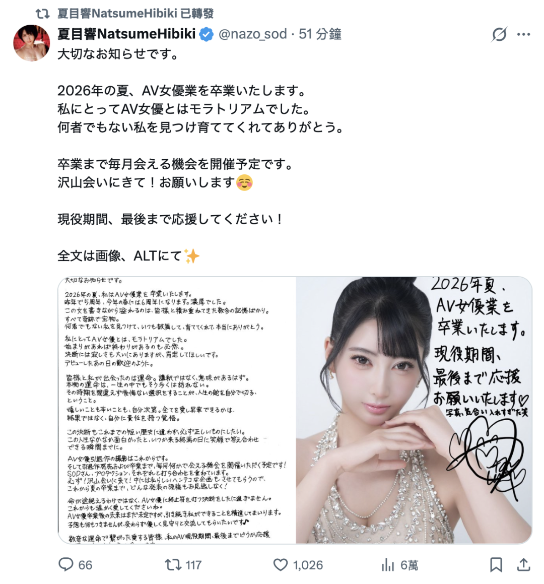 不久前才庆祝出道六周年的女优「夏目响」刚刚在社群发表重大声明,她以手写信告诉大家,将会在今年夏天的时候自业界女优这份工作「卒业」、意思就是业界引退了: