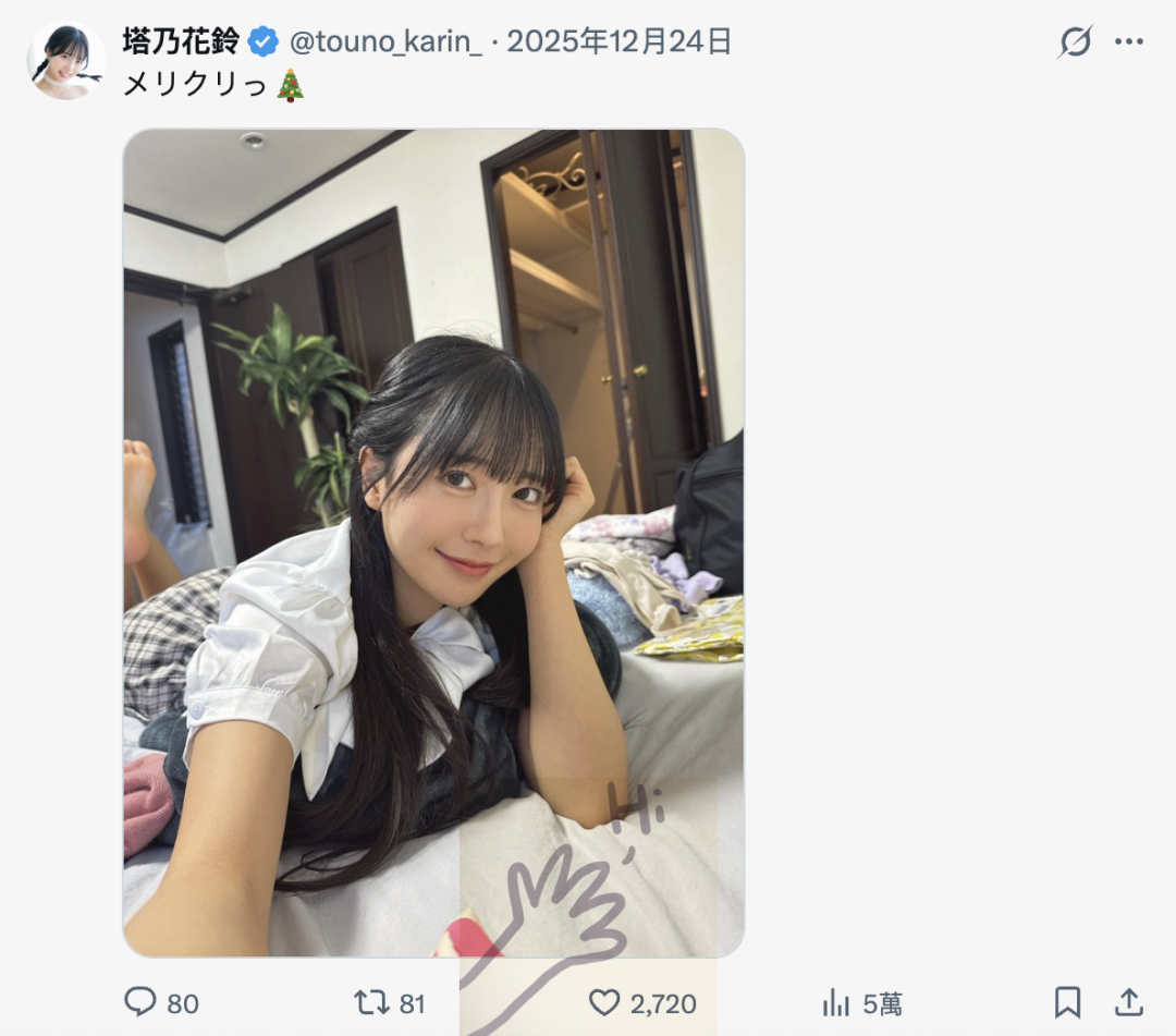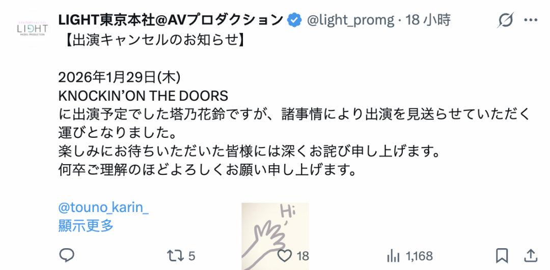 首先,她的X发文停留在去年平安夜,也就是说超过一个礼拜没发文了,更不要说之前社群还上锁,对她来说极不寻常; 再来,身为片商和经纪公司力捧的新生代女星,塔乃花铃被安排了很多活动,之前有去参加「英语禁止ボウリング」(英语禁止保龄球)的录影,但因为最近自社群上消失所以节目播出时她没有转播制作单位的发文,更奇怪的是原本安排好要在1月29日参加的拼盘演唱会「KNOCKIN’ ON THE DOORS」她也辞退了⋯