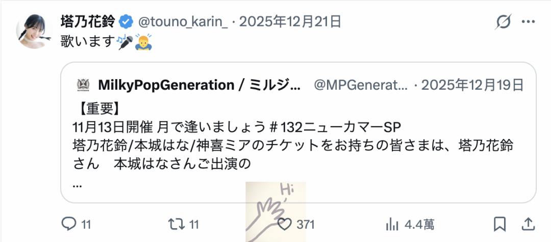 目前想到的就这三种可能,但不得不说,虽然自平安夜到现在不过十天的事,可是台面上看到的信息都感觉塔乃花铃的状况不只来得很急而且蛮不妙的,只希望经纪公司能妥善处理ー想想也真是感慨,明明上个月初举办橘メアリー(橘玛丽)的时候我们和经纪人私底下有问过塔乃花铃的状况,对方说塔乃蛮想参加海外活动的,结果两三个礼拜就变成现在这样子⋯