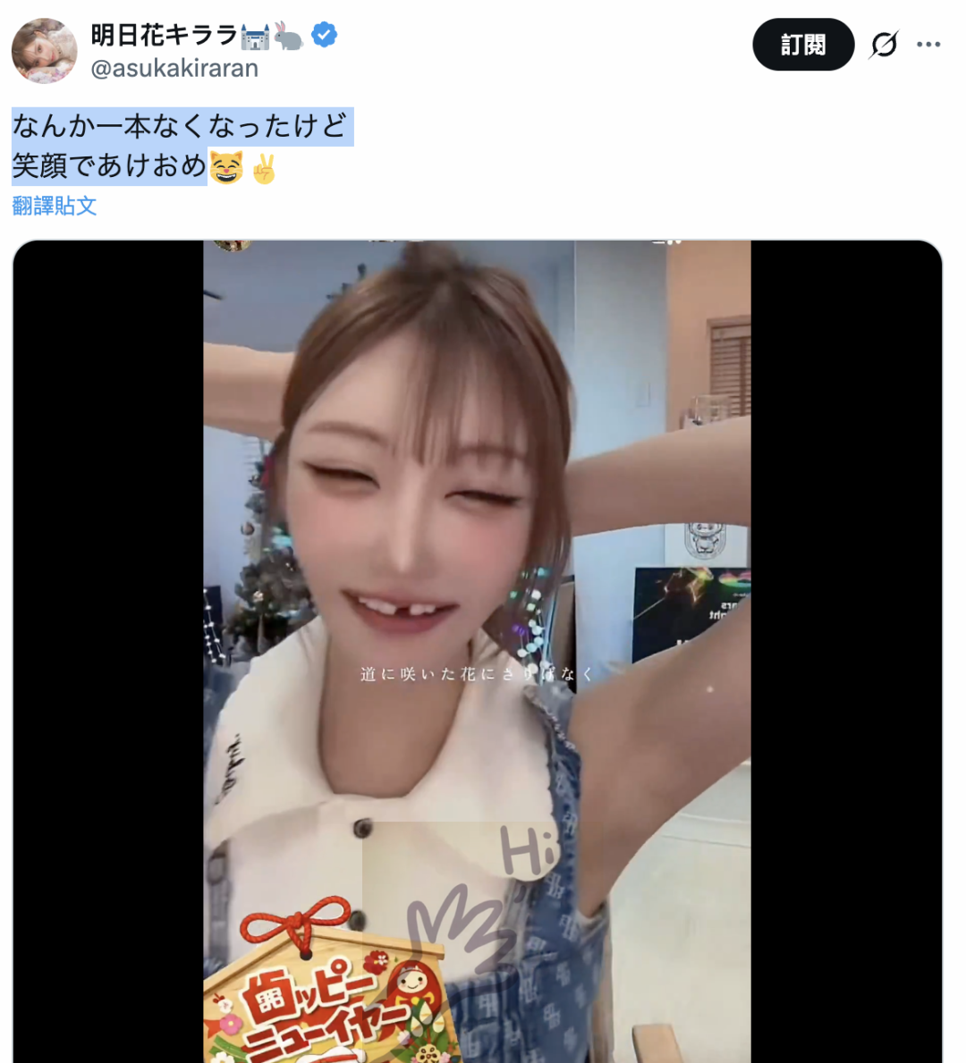 「なんか一本なくなったけど、笑顔であけおめ(虽然少了一颗牙、还是笑着祝大家新年快乐)」