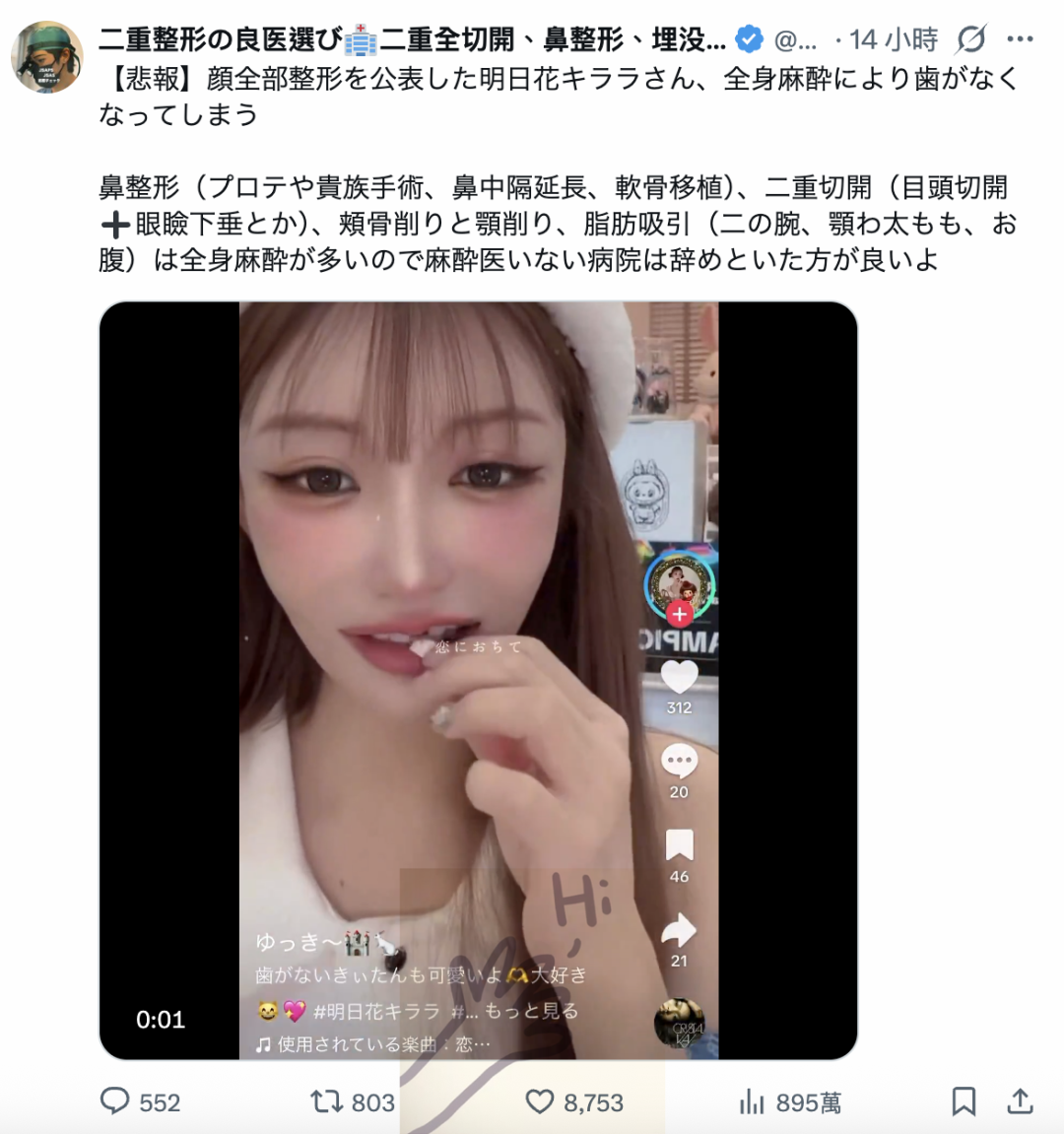 然后马上就有整型医生说了,明日花キララ(明日花绮罗)的症状是因为整型时接受全身麻醉的后遗症,这位医生呼吁,整型时选择有合格麻醉医师的诊所真的非常重要。