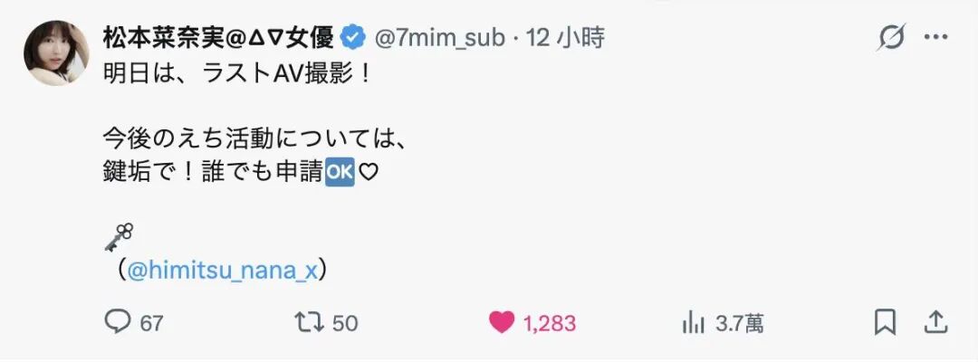 也难怪她要退社离开事务所了,因为不用拍片了,所以也不用研究离开事务所后松本菜奈実和片商之间要如何连结了;第二个重点则是松本菜奈実有提到,今后色色的活动(えち活动)将会在私密的小帐公布ー在这边和大家介绍一下,松本菜奈実用的是「键垢」,键,就是钥匙的意思,也就是说这帐号是有上锁的,必须要松本菜奈実同意才能追踪,现在是只要追踪她就OK,之后就不知道了⋯