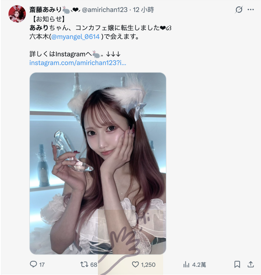 非常抱歉,因为经纪公司婉拒,所以我们没能请她来到台湾和大家说再见; 不过现在想要见她也不是问题,斎藤あみり(斋藤亚美里)今天于X宣布,要转生为コンカフェ嬢,也就是说ー