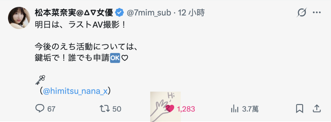 这个声明可以分两部分来看,首先,自然是松本菜奈実要进行最后一次的摄影,这也就意味道她自2017年3月于于Muteki开始的演绎生涯要告一段落了ー其实这样她也差不多在这一行整整发了九年的片子,在业界中算是很资深也很厉害了,而且就我的看法,松本菜奈実应该不是过气了没有片商要了,而是跳脱衣舞以及会计的工作逐渐成了她的主力,所以才决定放掉拍片这一块: