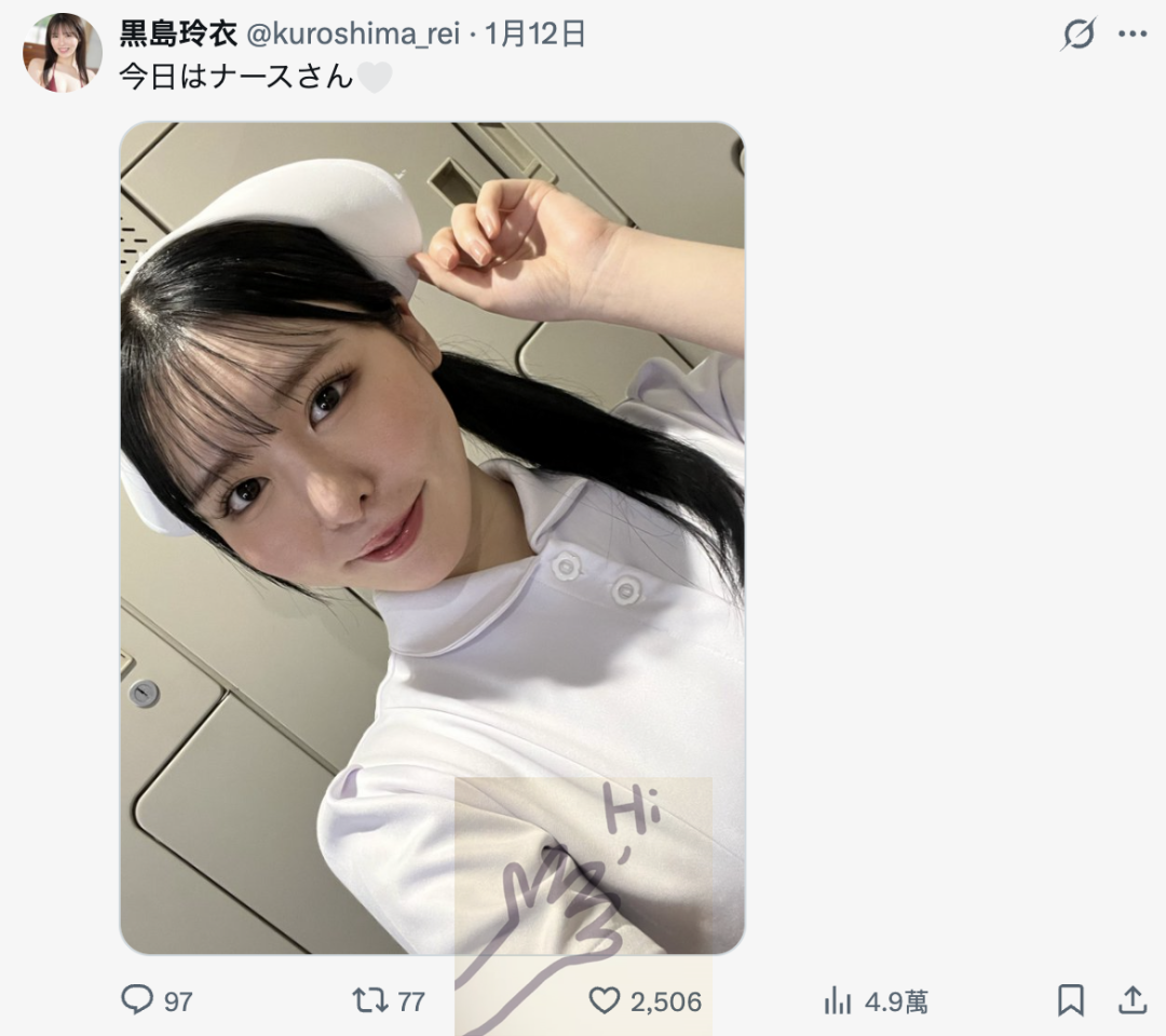 这也是她继去年9月以来的再度发文:自从离开S1后她就不怎么使用社群了,虽然片子发得不少,但社群完全没更新总让人觉得她拼完这波发片就会不玩了ー事实上之前她也真的休息了一阵子,不过藉由这张照片你就知道,黒岛玲衣回来了,而且又进棚拍片惹: