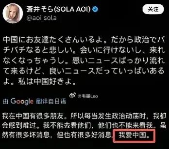 事情是这样的,今年1月底,苍井空在社交平台X上发了段心里话。她原话是这么说的:“我在中国有很多朋友,所以当政治导致关系紧张时,我会很伤心。因为我不能去见他们,他们也不能来日本。虽然有很多坏消息,但也有很多好消息。我喜欢中国。”
