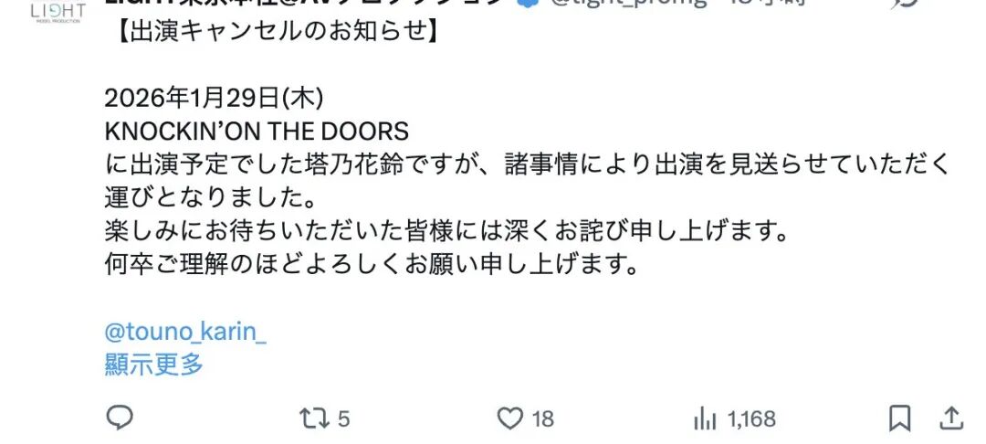 就在1月2号,其所属的事务所突然发布公告,宣布她原定于1月29日参加的「KNOCKIN’ ON THE DOORS」演出活动正式取消 。而且,就连原本要在23号出席的秋叶原举办的线下见面会也已确认中止,活动信息页面随后从相关网站删除 。