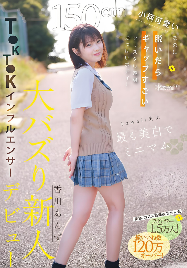 好可爱的学生妹啊!看到这种封面,一般艺人的人设都是 “刚毕业的可爱小妹直接入行”。不过现在都网络时代了,单纯的学生妹人设早勾不起大家的兴趣啦 , 所以封面左边标着 “T●KT●K”,明摆着是想说这位 “香川あんず(香川杏)” 是网红出身。