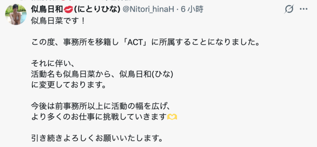 更换事务所!似鸟日菜宣布改名!