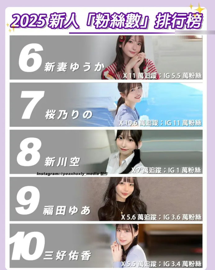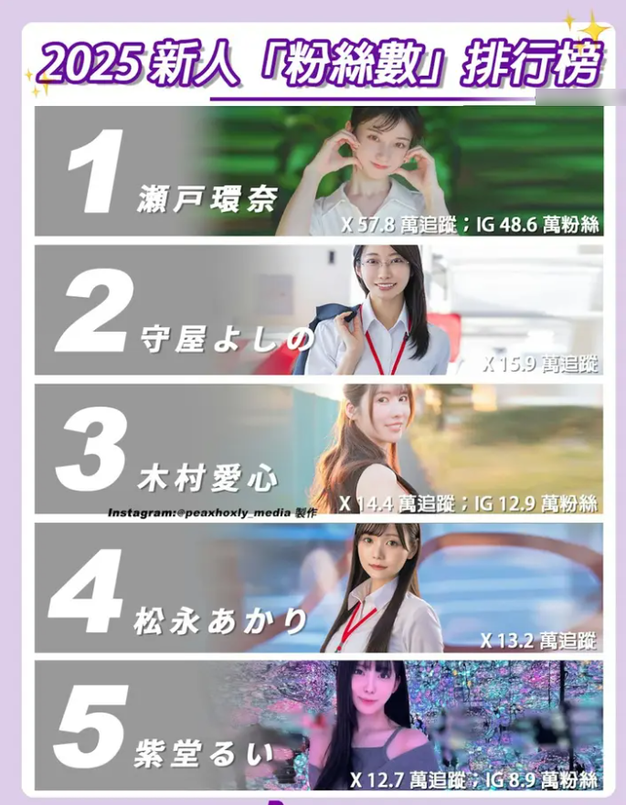 如果说引退潮是2025年业界的“遗憾底色”,那么「新人狂潮」便是最亮眼的“希望之光”。尽管主流影音串流平台FANZA官方官宣的「2025年度排行榜」尚未正式揭晓,但仅凭目前一众超新星在社交平台(SNS)累积的粉丝数,便能大致推测出今年“新人王”的归属,其中,有着「现象级新人」之称的濑户环奈,无疑是最大热门。