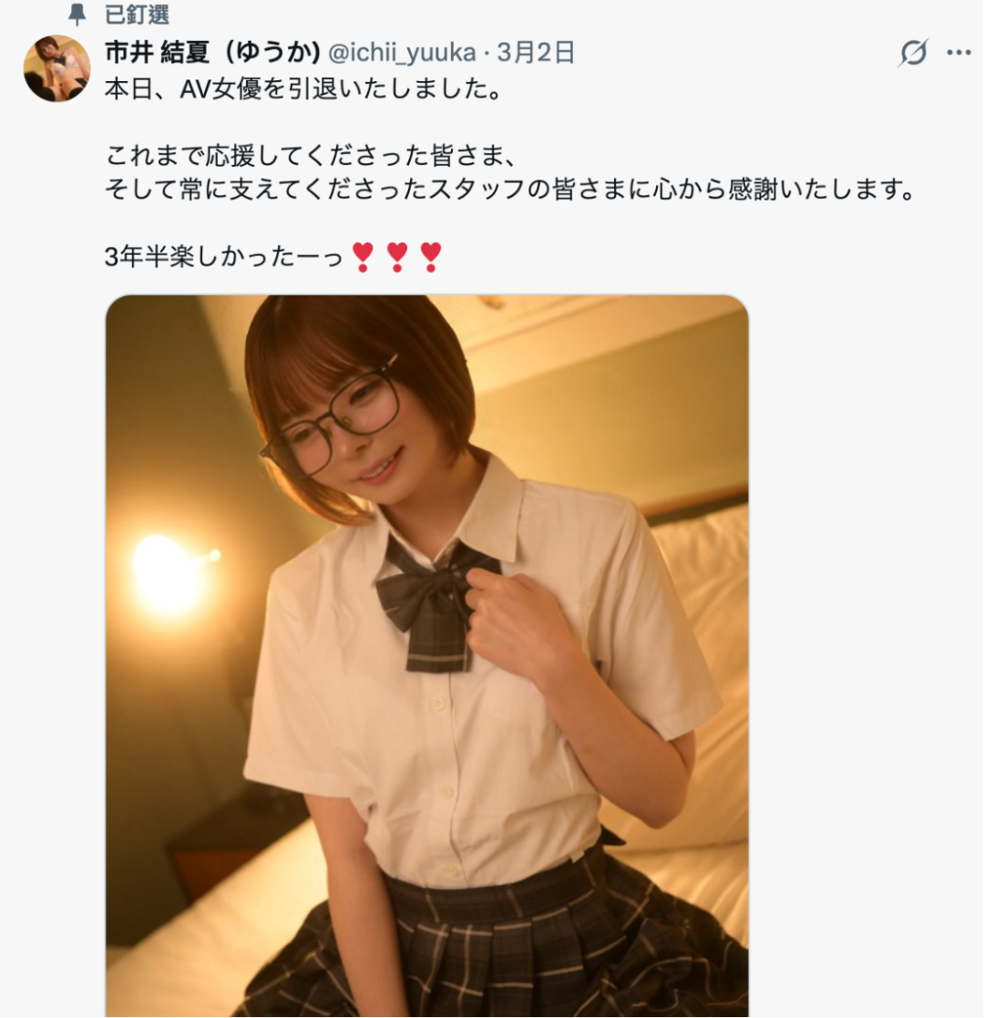 日本业界短发艺人市井结夏在3月2日在 X 上宣布 “本日引退”,一点预告都没有,当天说退就退,真的让人吓一跳!