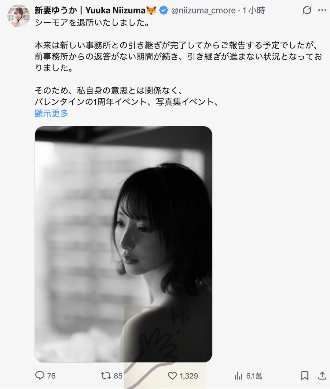 然后在昨晚的活动取消后,新妻ゆうか(新妻优香)发表声明,正式宣布退所、离开了C-More
