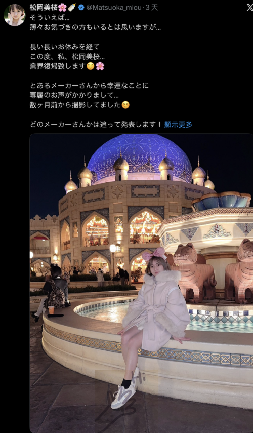 她是在X发文,说经过漫长的休息后,她,松冈美桜决定重回界发片了虽然休业了好长一段时间,不过她很幸运地得到某家片商的青睐,将以专属女星的形式发片,而且好几个月前就展开拍片的工作惹〜