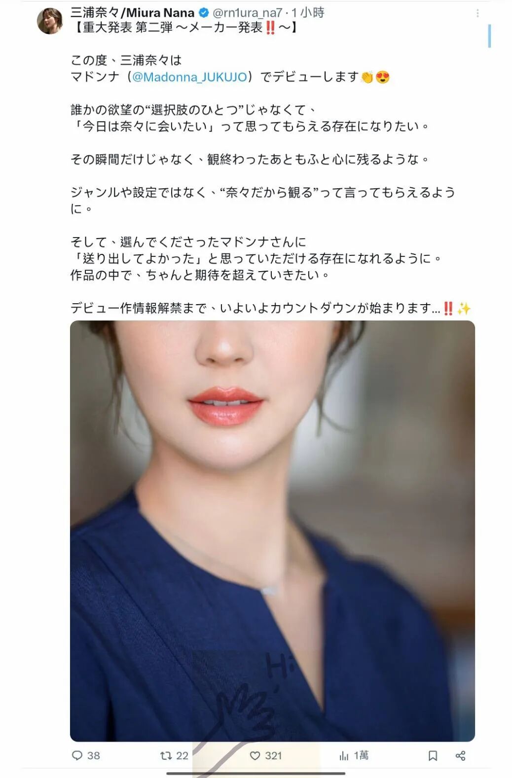 我是没有想到这位新人是直接宣布片商而不是用出道作情报解禁来公布答案,所以没有考虑到Madonna这个答案,对不起,我错了; 而在确定片商之后,三浦奈々在X写下了出道的心愿,她希望自己不是大家看片的选项之一,而是大家的唯一选择; 她不希望大家看完片发泄完就算了,而是希望大家看完片子后还能在心里悸动不已; 最后,她非常感谢Madonna的赏识,会全力以赴成为让这家片商觉得「能和她合作真的太好了」的存在⋯
